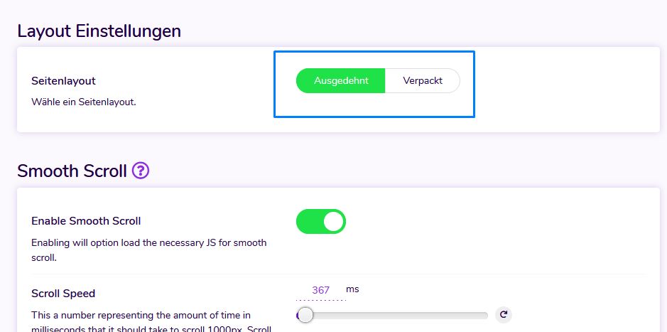 Wenn Sie Smooth Scroll aktivieren, wird die Datei Smooth-Scroll.js geladen, die ermöglicht es sog. Onepage Designs zu erstellen.
